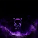 Headset Razer Kraken Kitty V2 – Gengar Edition iluminado em tons de roxo, exibido sobre rochas escuras com fumaça púrpura, remetendo à estética fantasmagórica do Pokémon Gengar.