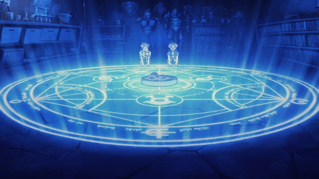 A tragédia dos irmãos começa com o tabu da transmutação humana. Movidos pela saudade da mãe, eles tentam quebrar as regras da alquimia — e pagam caro por isso. Edward perde um braço e uma perna; Alphonse, o corpo inteiro.