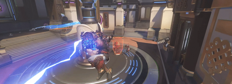 Já a skin mítica de arma da Orisa, o Canhão de Cápsulas, segue um caminho oposto em termos de estética. Aqui a proposta é mais lúdica e chamativa, com pequenos brinquedinhos fofos e coloridos, efeitos brilhantes e animações que evoluem conforme as eliminações acontecem. Cada abate aumenta o impacto visual da arma, enquanto os floreios passam a sensação de estar abrindo pequenas cápsulas de prêmio. No nível máximo, os efeitos estrelados de eliminação transformam o campo de batalha em algo próximo de um espetáculo neon.