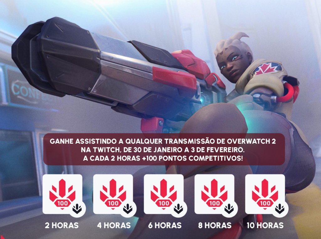 Paralelamente ao evento de Ímpetos, a Blizzard liberou Drops de Pontos Competitivos na Twitch, totalizando 500 pontos para quem assistir transmissões qualificadas de Overwatch 2. Basta acessar o canal do seu streamer favorito de overwatch 2 e manter a live aberta pelo tempo exigido para que as recompensas sejam liberadas na conta vinculada.